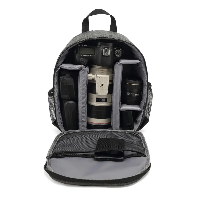 The camera bag is multi-functional to storage your cameras, accessories, water bottle, phone and other small things. Waterproof material and reasonable space, the backpack is suitable for outdoors or travel.